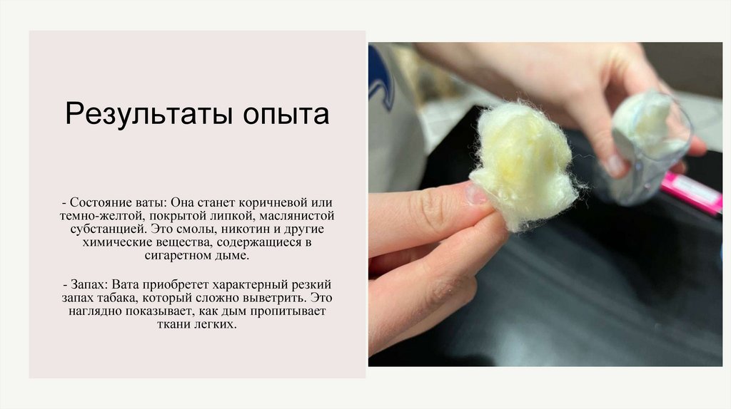 Результаты опыта- Состояние ваты: Она станет коричневой или