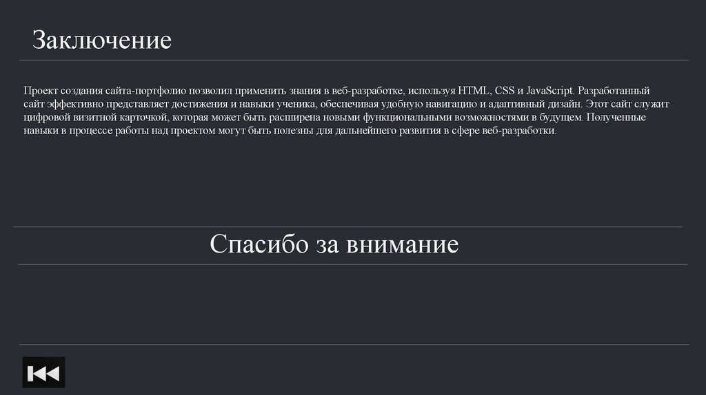 ЗаключениеПроект создания сайта-портфолио позволил применить знания в веб-разработке, используя HTML, CSS и JavaScript. Разработанный