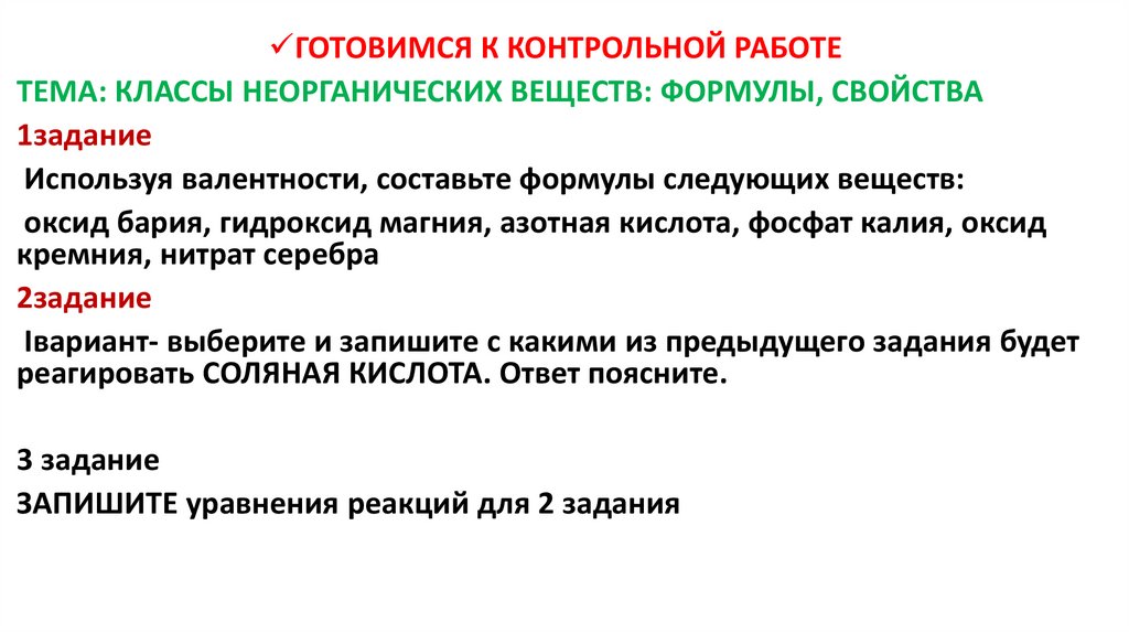 ГОТОВИМСЯ К КОНТРОЛЬНОЙ РАБОТЕТЕМА: КЛАССЫ НЕОРГАНИЧЕСКИХ ВЕЩЕСТВ: ФОРМУЛЫ, СВОЙСТВА