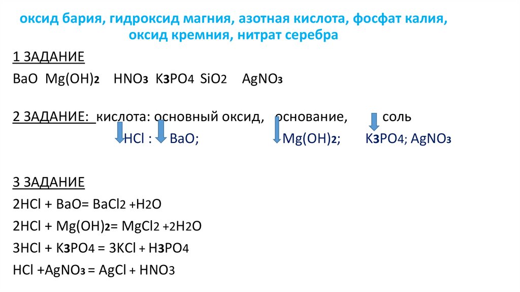 ВаО Mg(OH)2 HNO3 K3PO4 SiO2 AgNO3