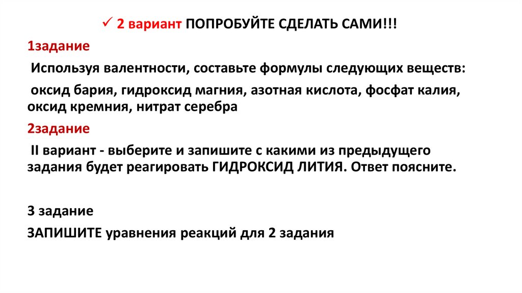 2 ЗАДАНИЕ: кислота: основный оксид, основание,