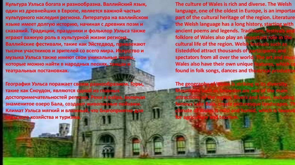 Культура Уэльса богата и разнообразна. Валлийский язык,один из древнейших в Европе, является важной частью