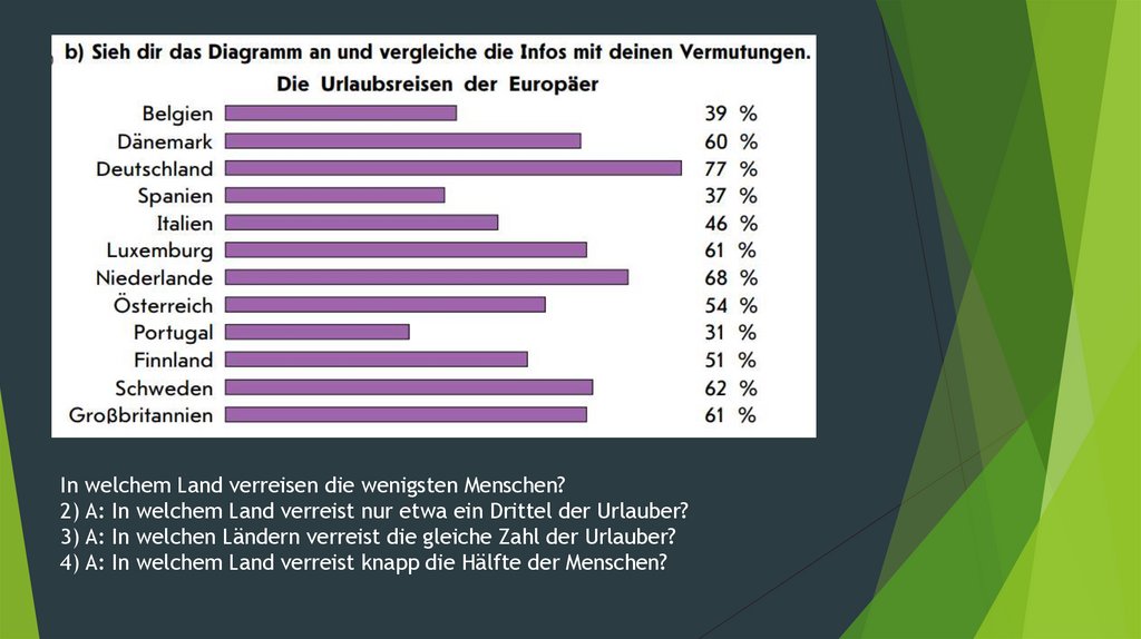 In welchem Land verreisen die wenigsten Menschen?2) A: In welchem Land verreist nur etwa ein Drittel der Urlauber?