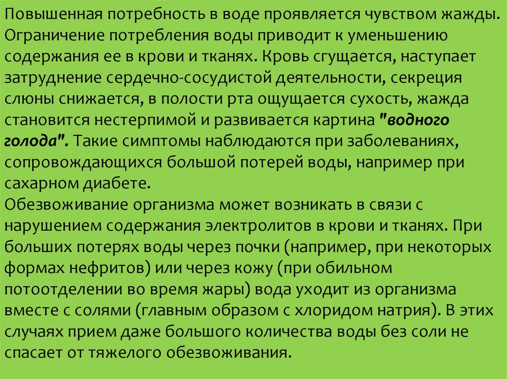 Повышенная потребность в воде проявляется чувством жажды.Ограничение потребления воды приводит к уменьшению