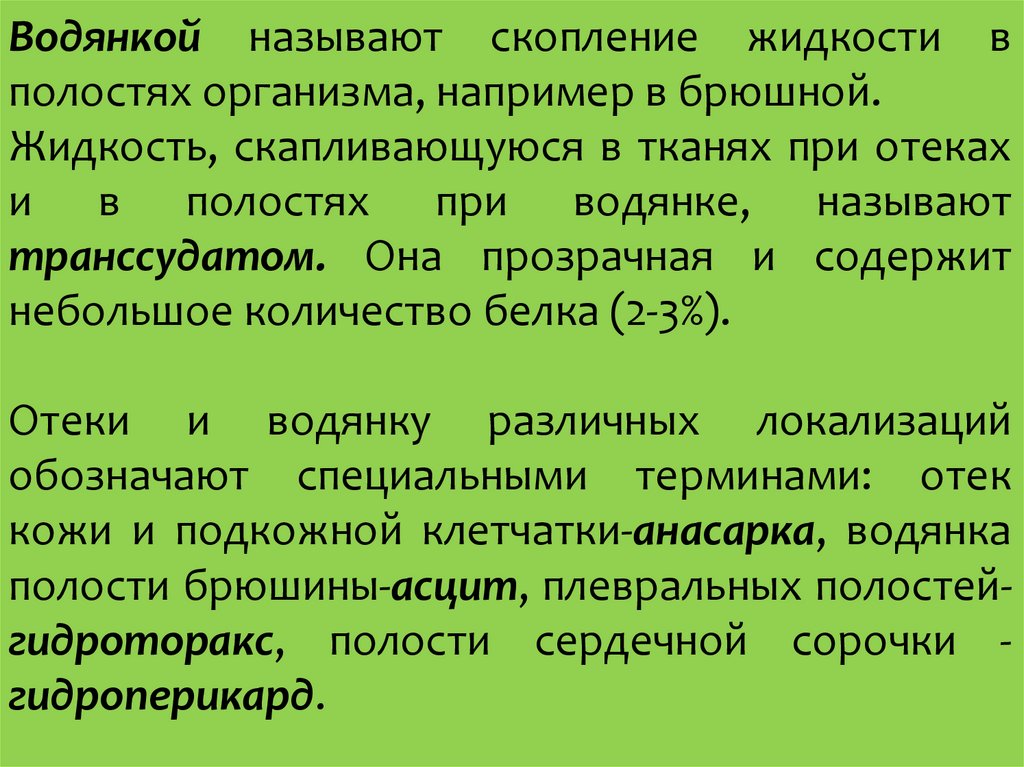 Водянкой называют скопление жидкости вполостях организма, например в брюшной.