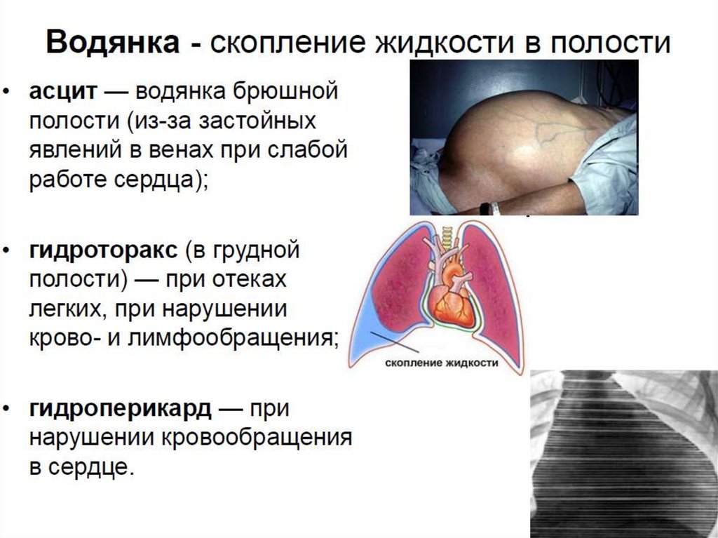 полости брюшины-асцит, плевральных полостейгидроторакс, полости сердечной сорочки гидроперикард.