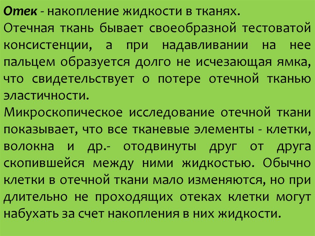 Отек - накопление жидкости в тканях.Отечная ткань бывает своеобразной тестоватой
