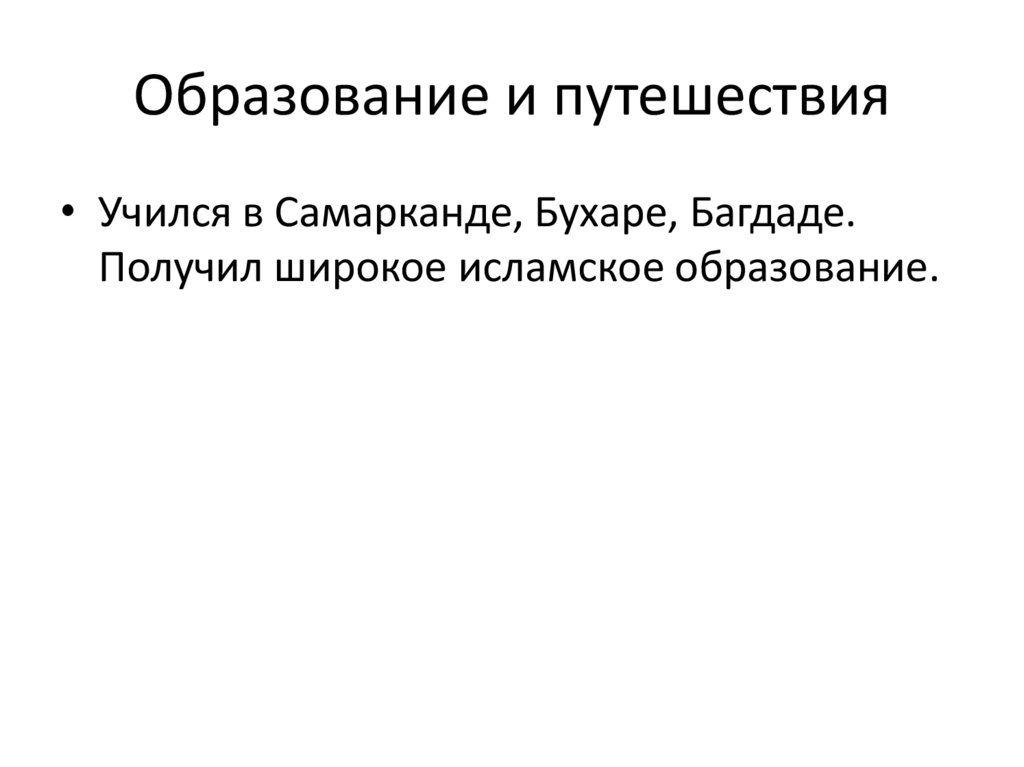 Образование и путешествия• Учился в Самарканде, Бухаре, Багдаде.