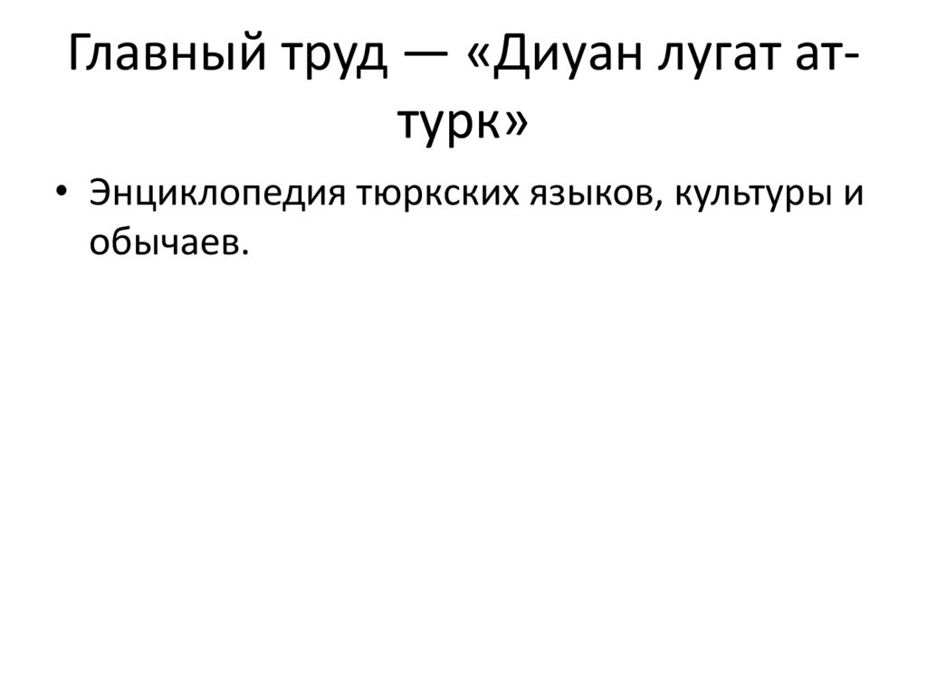 Главный труд — «Диуан лугат аттурк»• Энциклопедия тюркских языков, культуры и