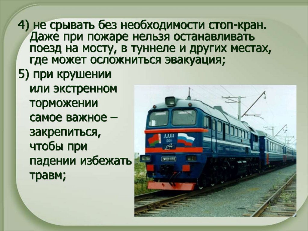 4) не срывать без необходимости стоп-кран.Даже при пожаре нельзя останавливать