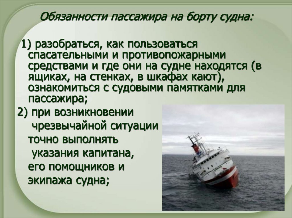 Обязанности пассажира на борту судна:1) разобраться, как пользоваться