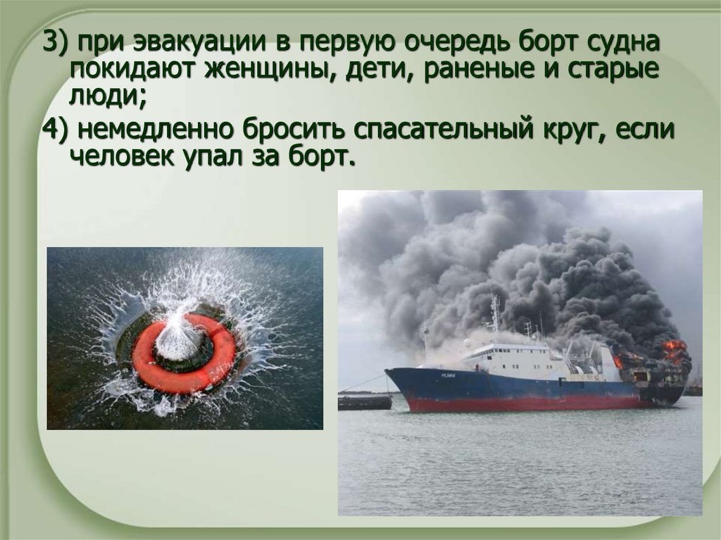 3) при эвакуации в первую очередь борт суднапокидают женщины, дети, раненые и старые