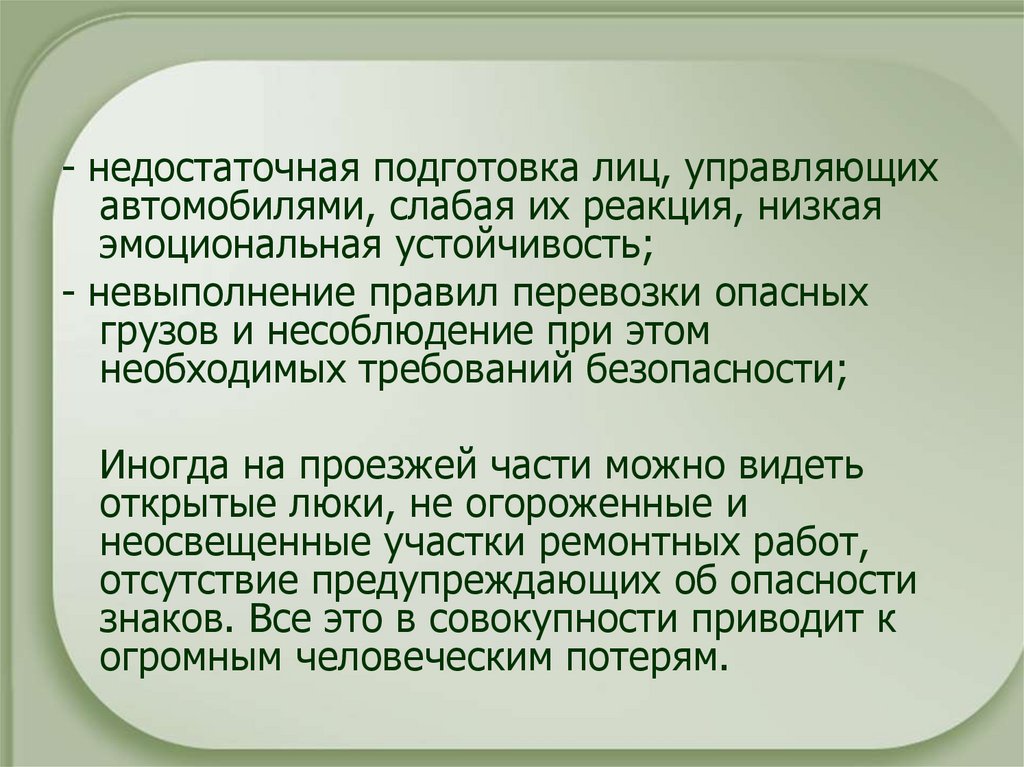 - недостаточная подготовка лиц, управляющихавтомобилями, слабая их реакция, низкая