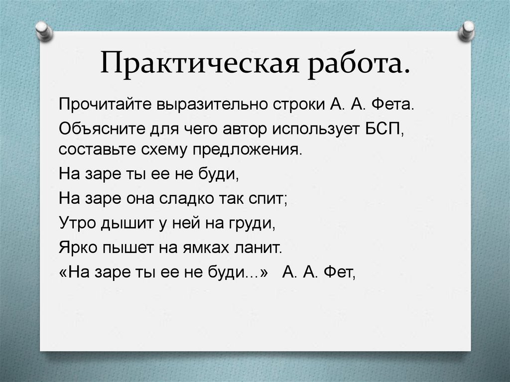 Прочитайте выразительно строки А. А. Фета.Объясните для чего автор использует БСП,