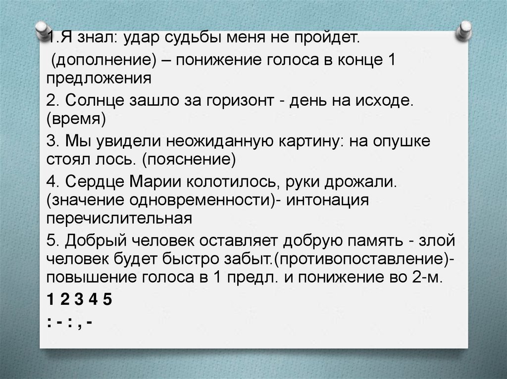 1.Я знал: удар судьбы меня не пройдет.(дополнение) – понижение голоса в конце 1