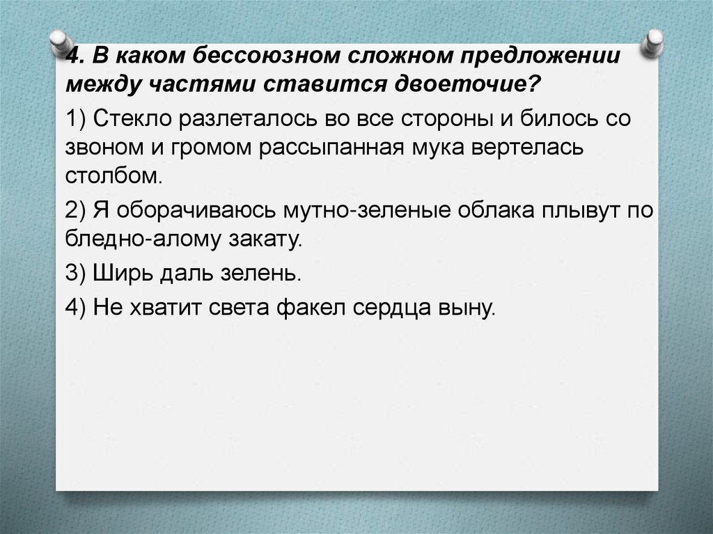 4. В каком бессоюзном сложном предложениимежду частями ставится двоеточие?