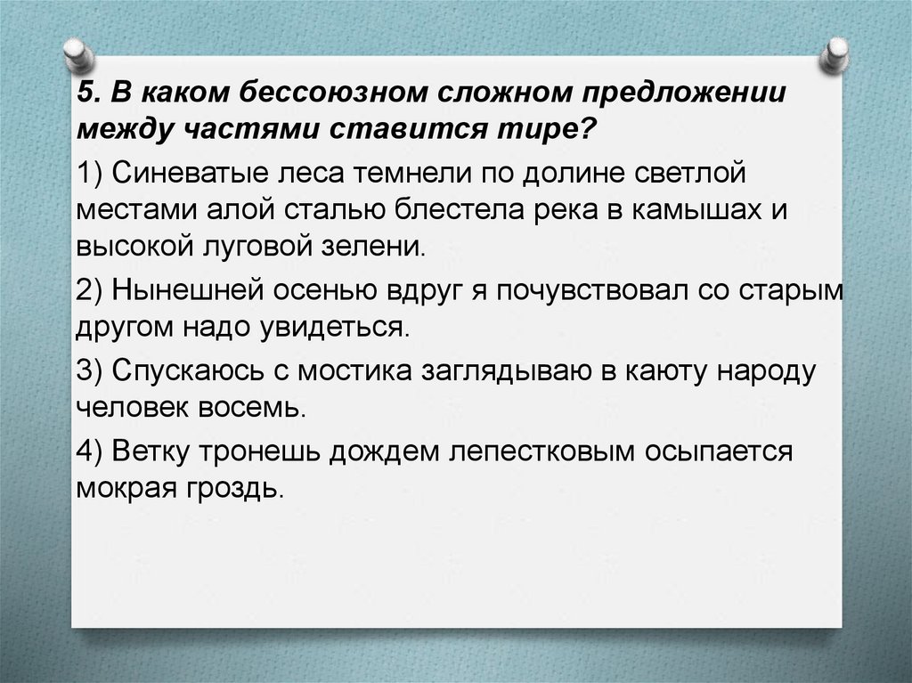 5. В каком бессоюзном сложном предложениимежду частями ставится тире?