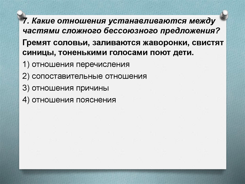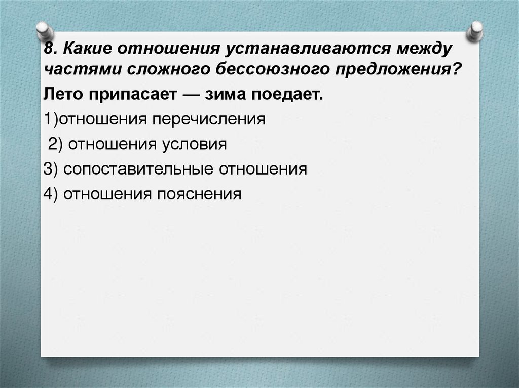 8. Какие отношения устанавливаются междучастями сложного бессоюзного предложения?