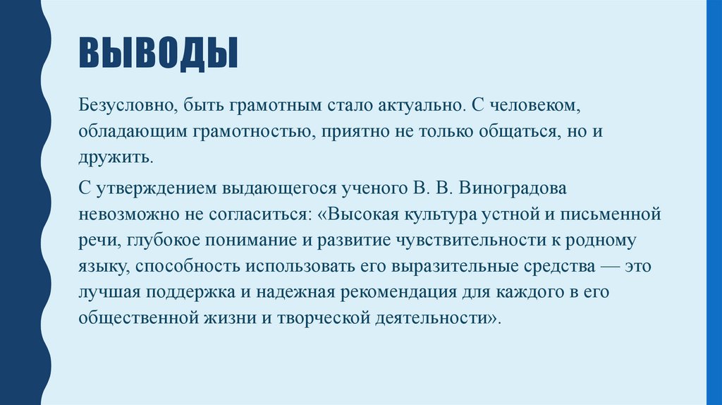 ВЫВОДЫБезусловно, быть грамотным стало актуально. С человеком,