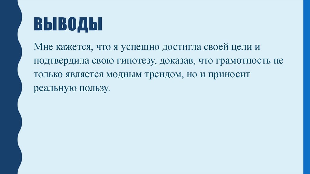 Мне кажется, что я успешно достигла своей цели иподтвердила свою гипотезу, доказав, что грамотность не