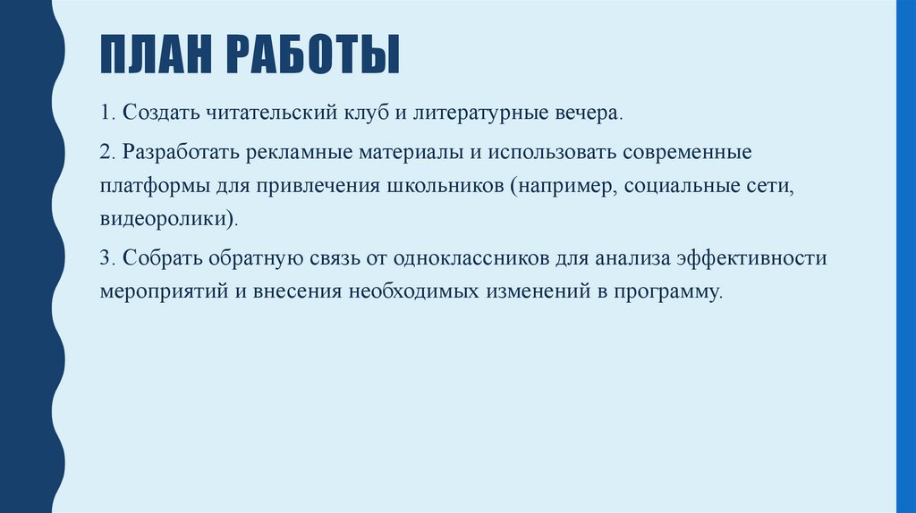 ПЛАН РАБОТЫ1. Создать читательский клуб и литературные вечера.