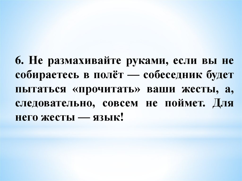 6. Не размахивайте руками, если вы несобираетесь в полёт — собеседник будет