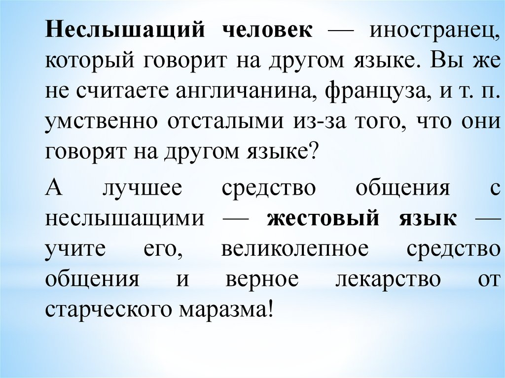 Неслышащий человек — иностранец,который говорит на другом языке. Вы же