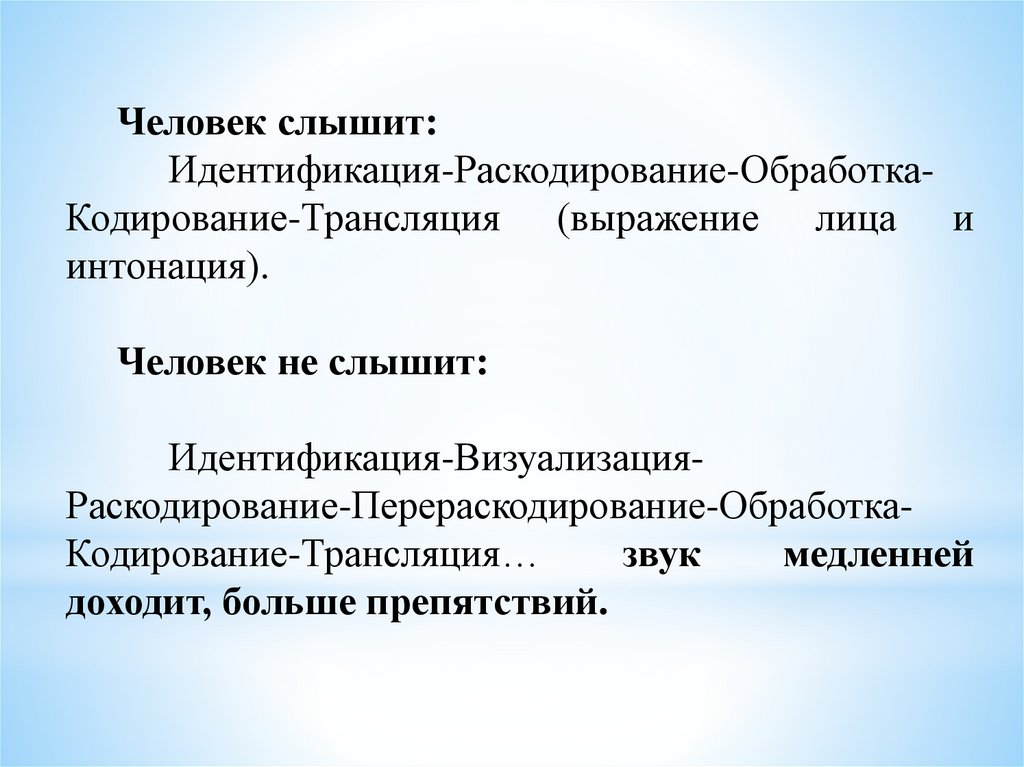 Человек слышит:Идентификация-Раскодирование-ОбработкаКодирование-Трансляция (выражение лица и