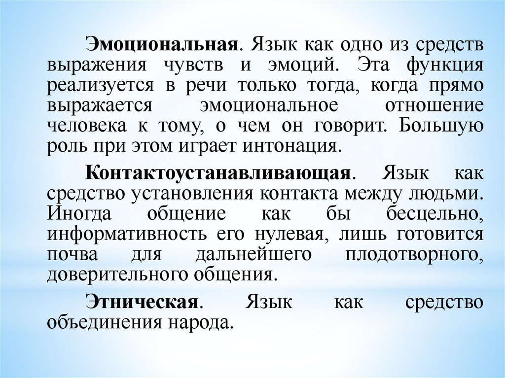 Эмоциональная. Язык как одно из средстввыражения чувств и эмоций. Эта функция