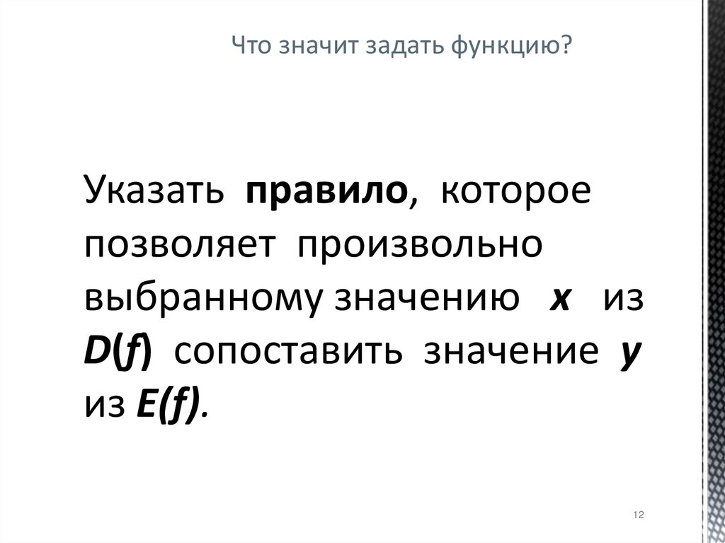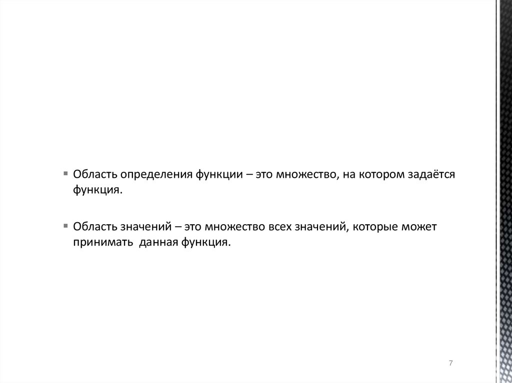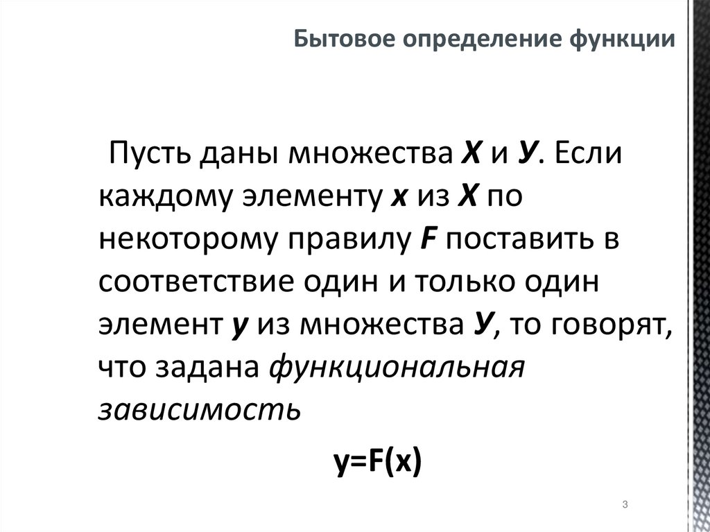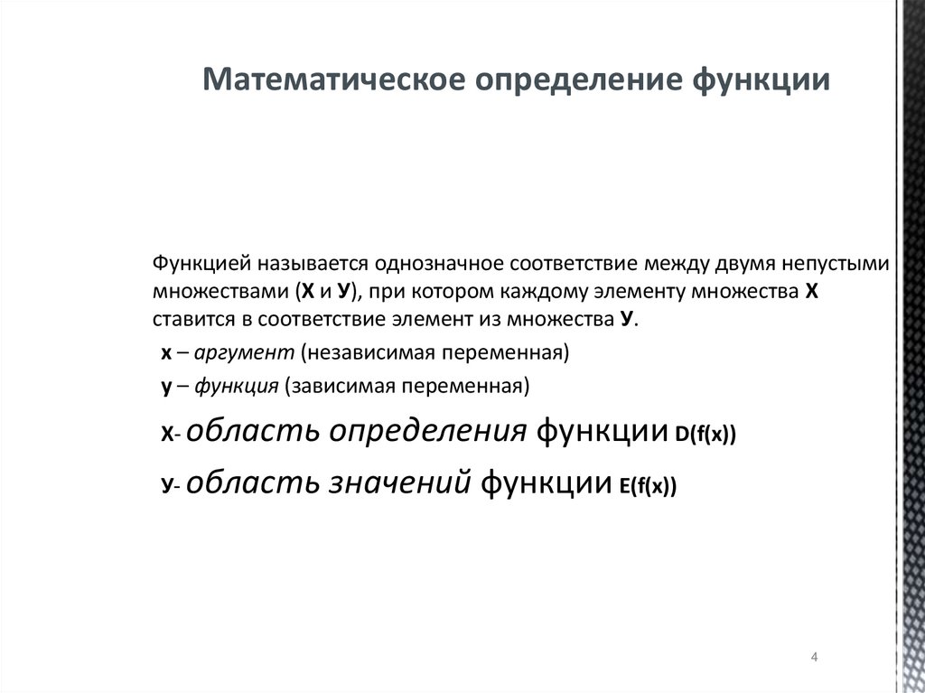 Функцией называется однозначное соответствие между двумя непустымимножествами (Х и У), при котором каждому элементу множества Х