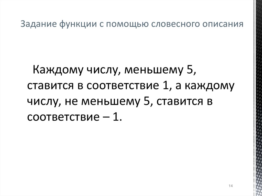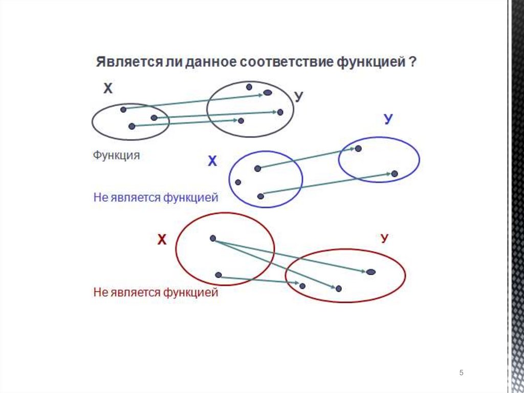 Каждому числу, меньшему 5,ставится в соответствие 1, а каждому