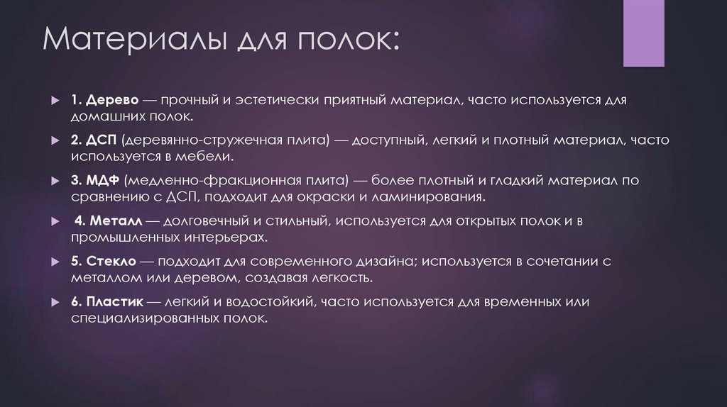 1. Дерево — прочный и эстетически приятный материал, часто используется длядомашних полок.