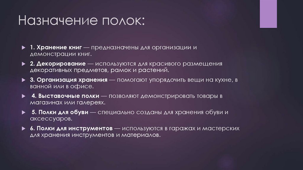 1. Хранение книг — предназначены для организации идемонстрации книг.
