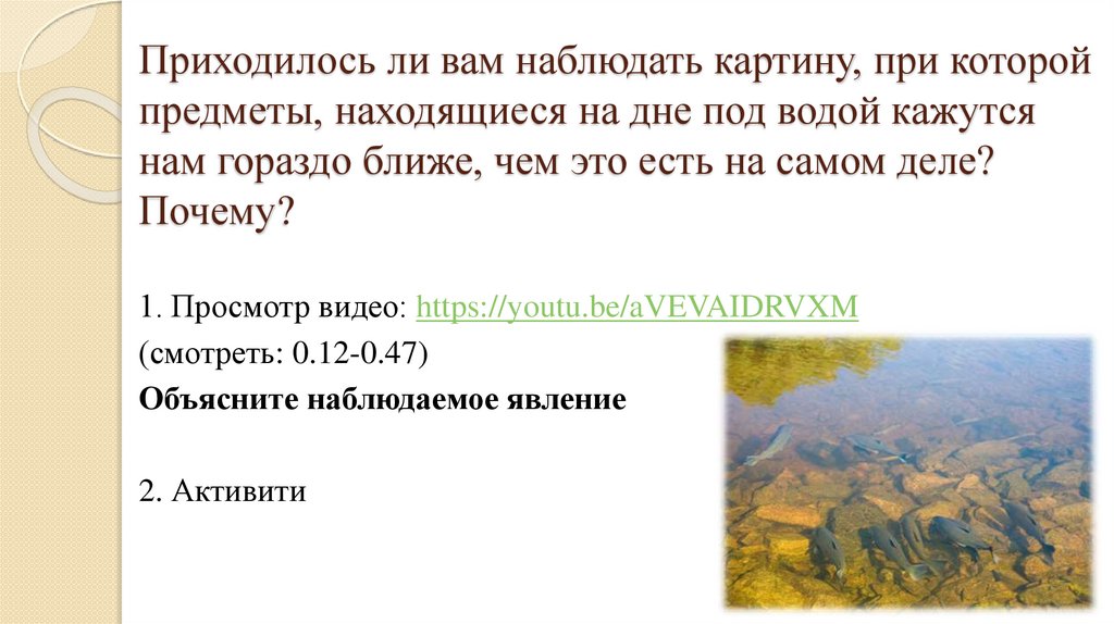 1. Приходилось ли вам наблюдать картину, при которой предметы, находящиеся на дне под водой кажутся нам гораздо ближе, чем это