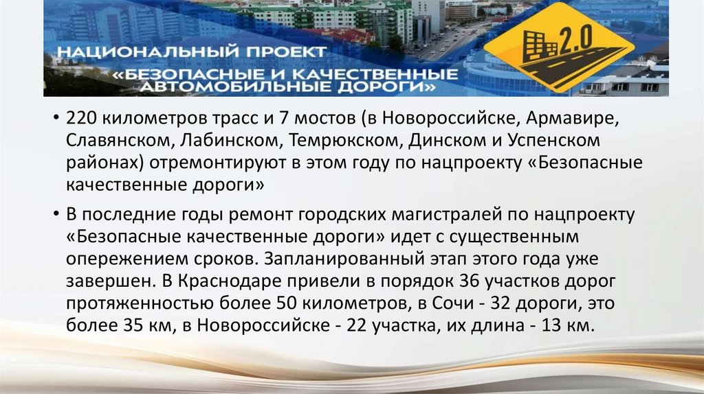 • 220 километров трасс и 7 мостов (в Новороссийске, Армавире,Славянском, Лабинском, Темрюкском, Динском и Успенском