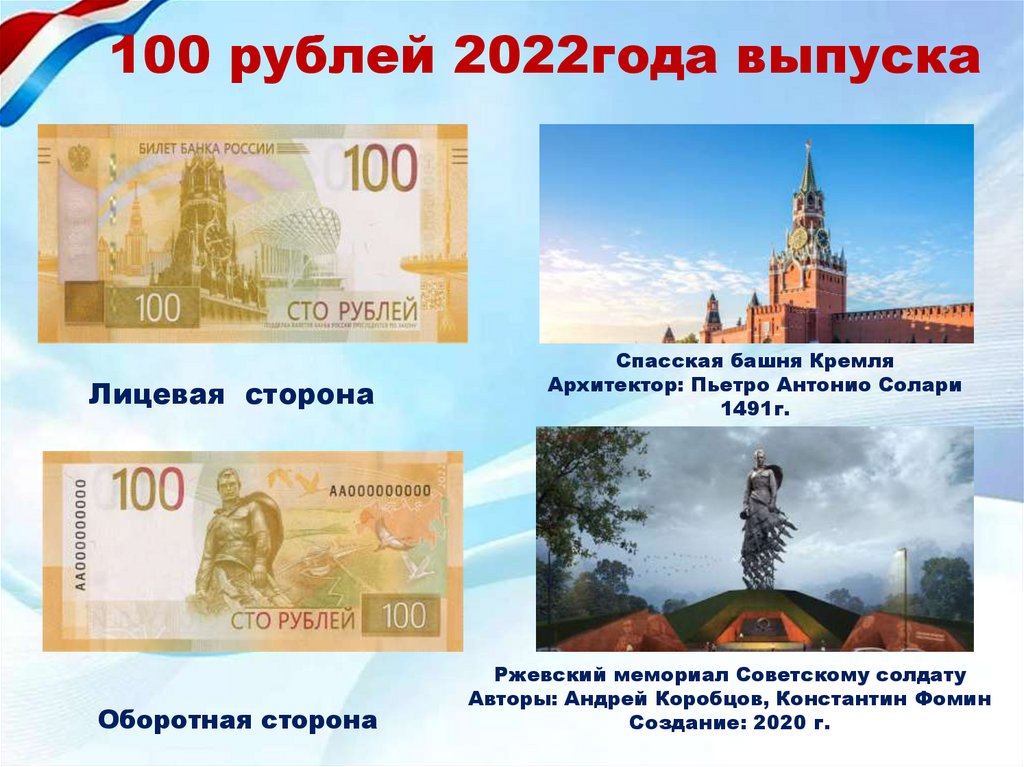 100 рублей 2022года выпускаЛицевая сторона