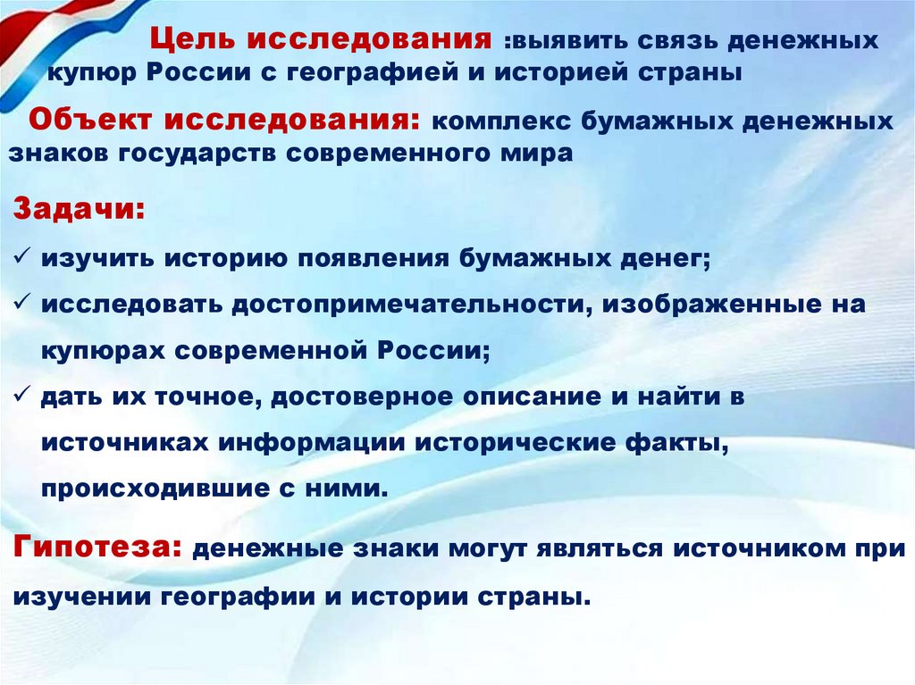 Цель исследования :выявить связь денежныхкупюр России с географией и историей страны