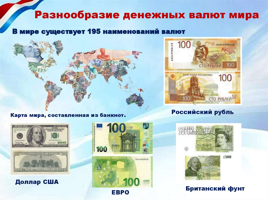 Разнообразие денежных валют мираВ мире существует 195 наименований валют