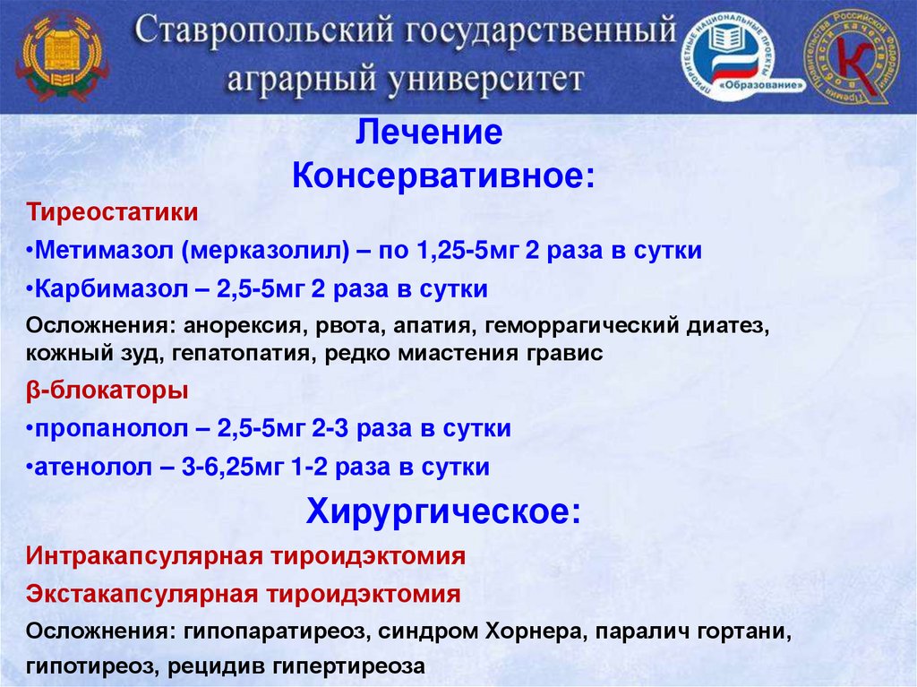 •Метимазол (мерказолил) – по 1,25-5мг 2 раза в сутки