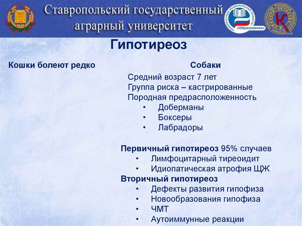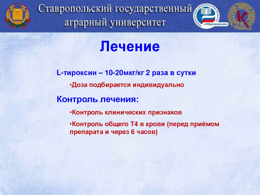 ЛечениеL-тироксин – 10-20мкг/кг 2 раза в сутки