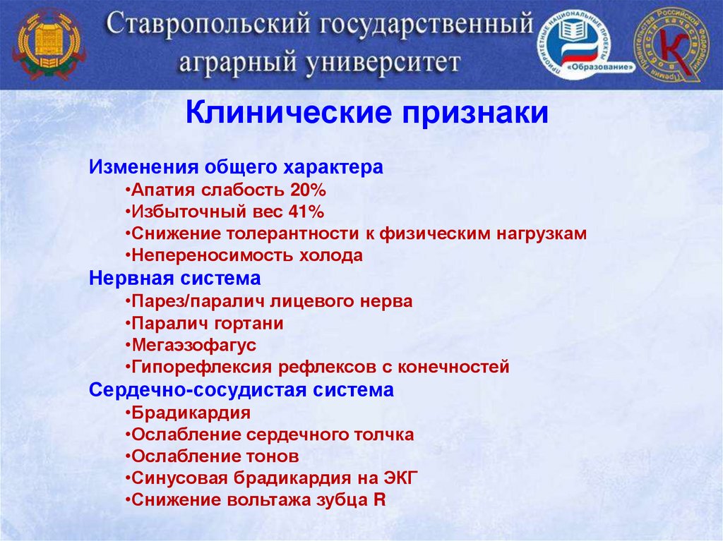 Клинические признакиИзменения общего характера