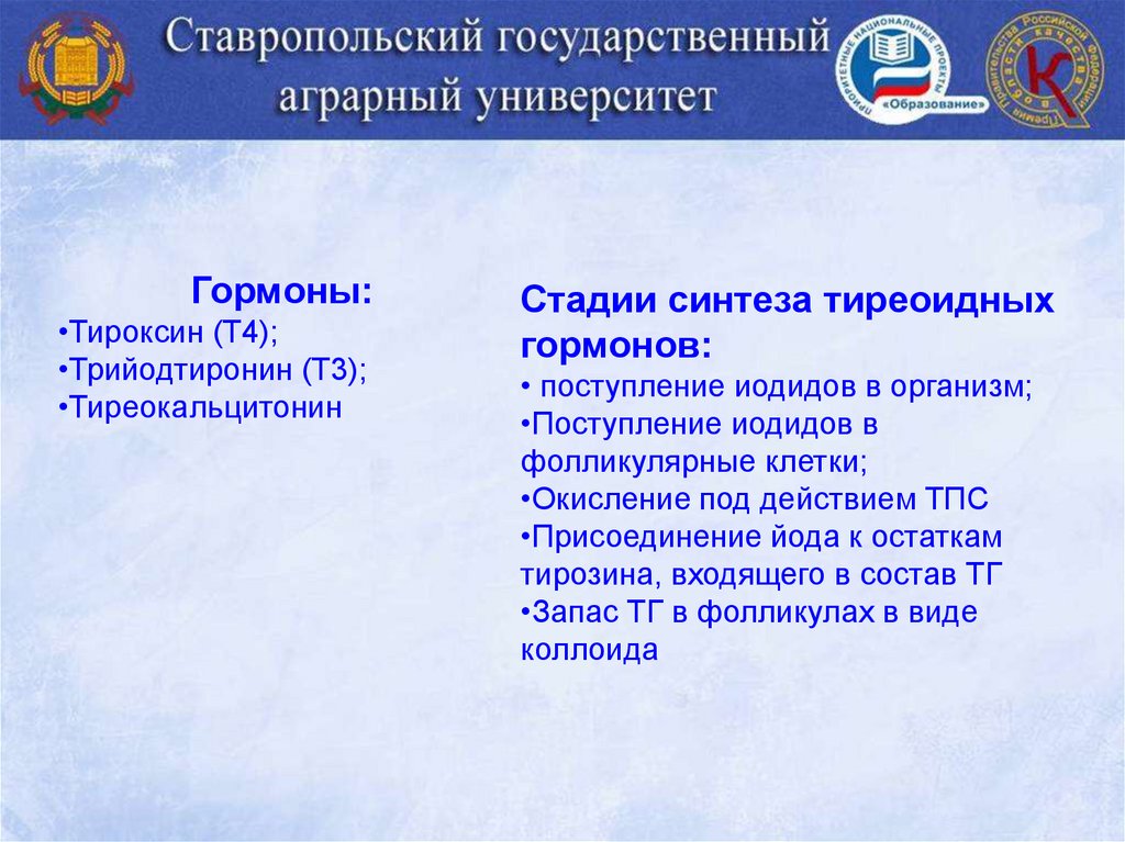 Гормоны:•Тироксин (Т4);