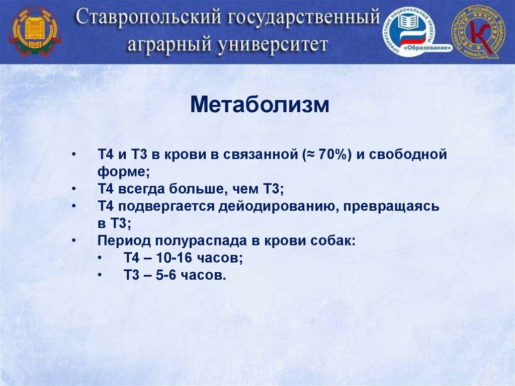 МетаболизмТ4 и Т3 в крови в связанной (≈ 70%) и свободной