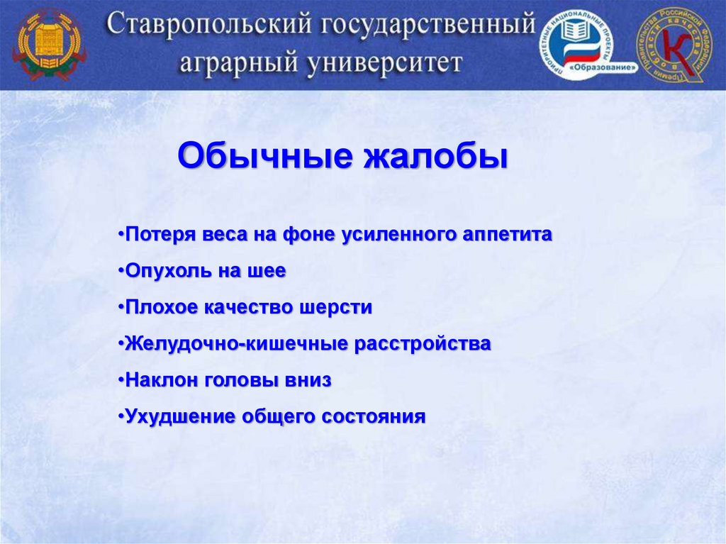 Обычные жалобы•Потеря веса на фоне усиленного аппетита