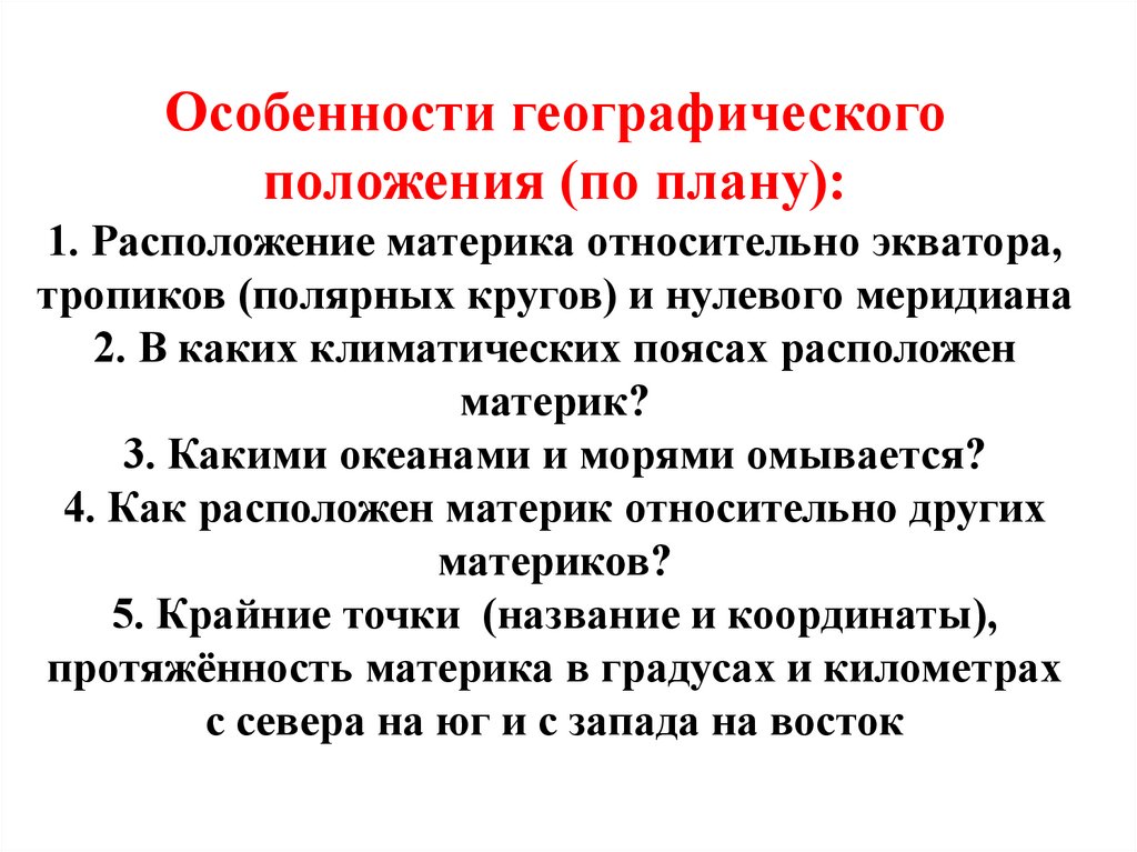 2. Особенности географического положения (по плану): 1. Расположение материка относительно экватора, тропиков (полярных кругов) и