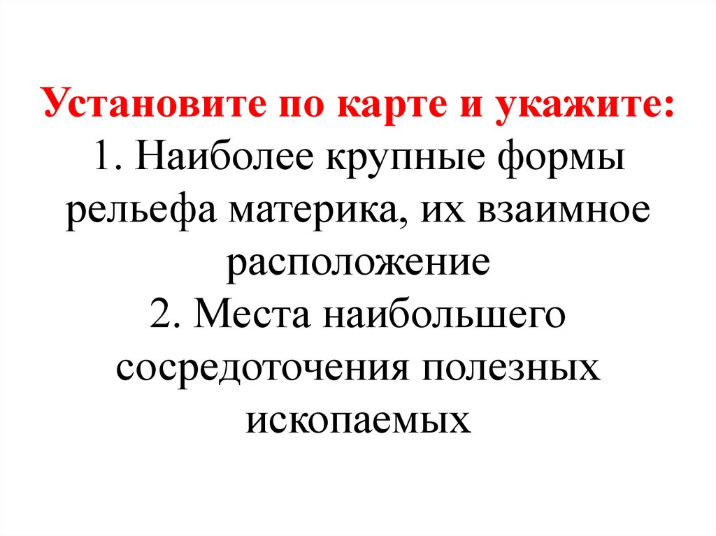 14. Установите по карте и укажите: 1. Наиболее крупные формы рельефа материка, их взаимное расположение 2. Места наибольшего