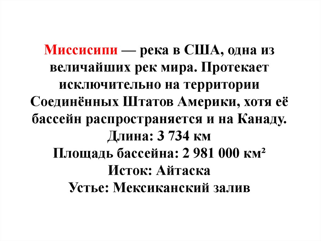 34. Миссисипи — река в США, одна из величайших рек мира. Протекает исключительно на территории Соединённых Штатов Америки, хотя её