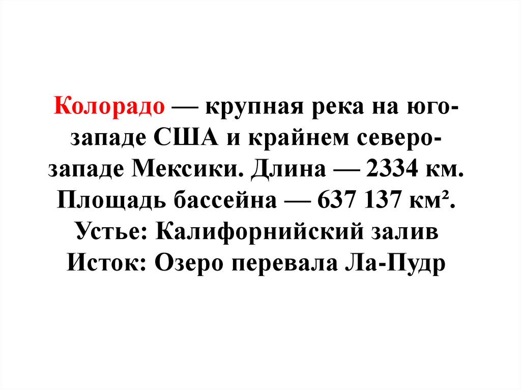 Колорадо — крупная река на югозападе США и крайнем северозападе Мексики. Длина — 2334 км.Площадь бассейна — 637 137 км².