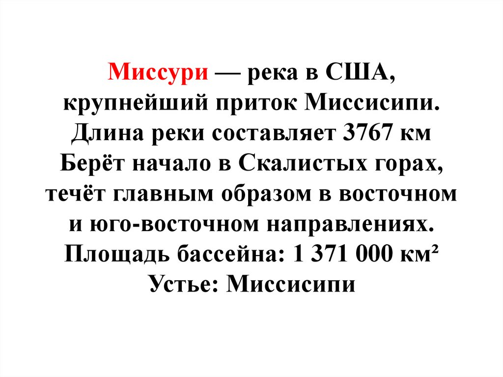 36. Миссури — река в США, крупнейший приток Миссисипи. Длина реки составляет 3767 км Берёт начало в Скалистых горах, течёт главным