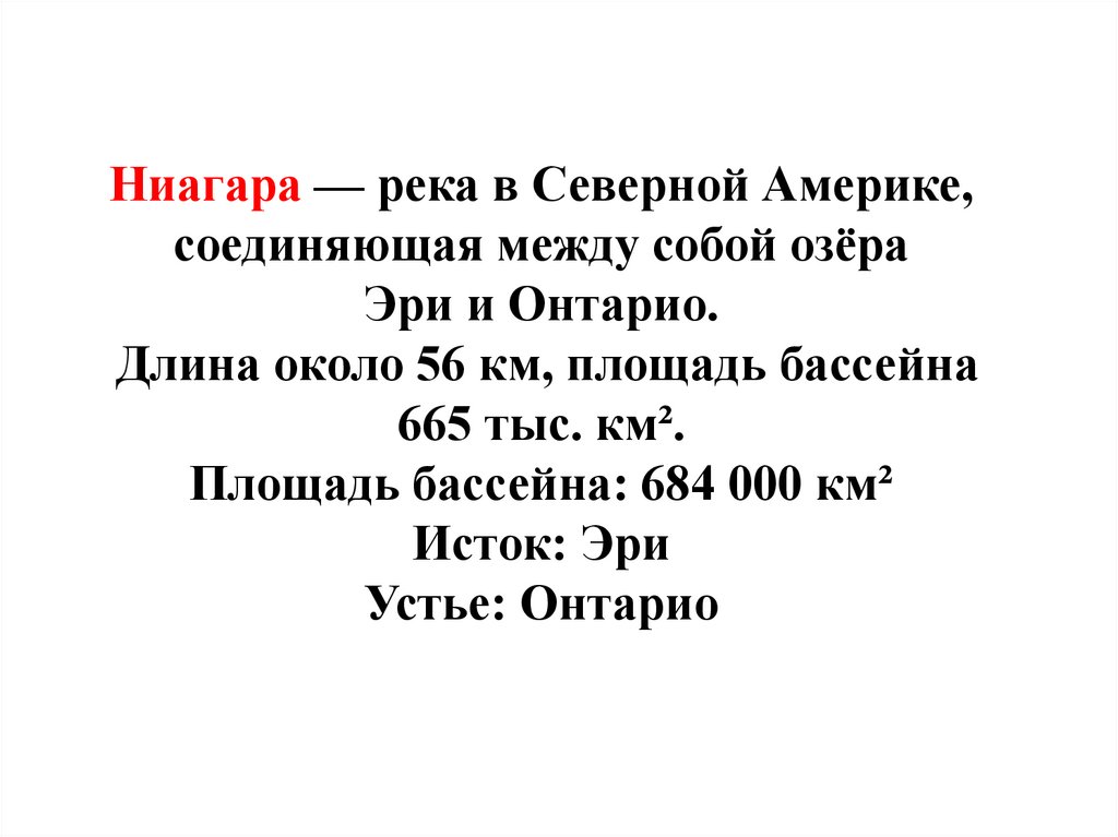 37. Ниагара — река в Северной Америке, соединяющая между собой озёра Эри и Онтарио. Длина около 56 км, площадь бассейна 665 тыс.